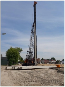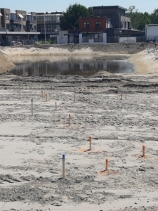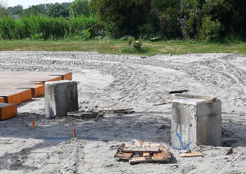 Deze week is gestart met de bouw van de brug. ’s Morgens werden de heistelling en de heipalen gebracht waarna halverwege de dag de eerste palen voor de brug werden geslagen. In totaal worden er voor de brug 20 palen geheid, vervolgens worden de damwanden aangebracht. Het aanbrengen van de damwanden en heipalen duurt circa twee weken.